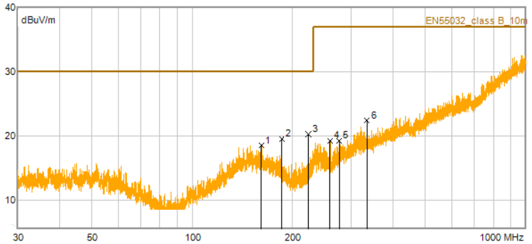 中顯科技YY系列串口屏采取了有效的輻射發(fā)射抑制措施,全系產(chǎn)品都可以達到ClassB等級要求。SDWb、SDWn、SDWa三個系列的部分型號串口屏,在不做任何整改措施下也可以達到ClassB等級要求,如圖2所示為SDWb070T84T串口屏在裸露狀態(tài)下的測試數(shù)據(jù)波形。如對輻射發(fā)射性能有要求的應(yīng)用,歡迎聯(lián)系咨詢!